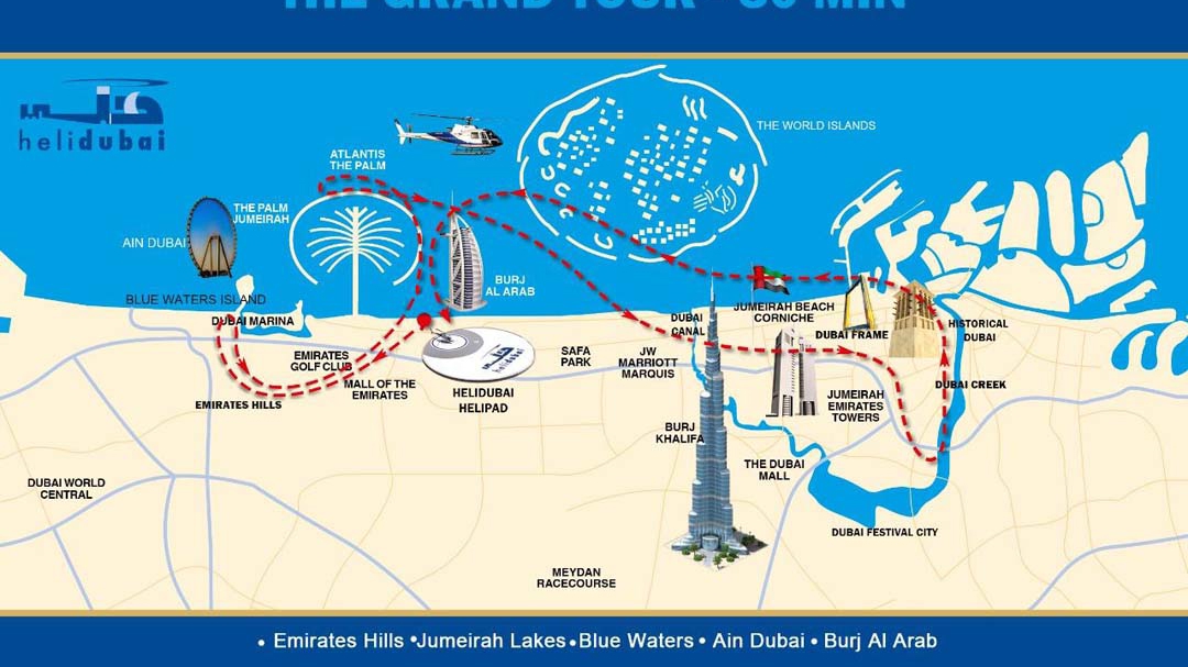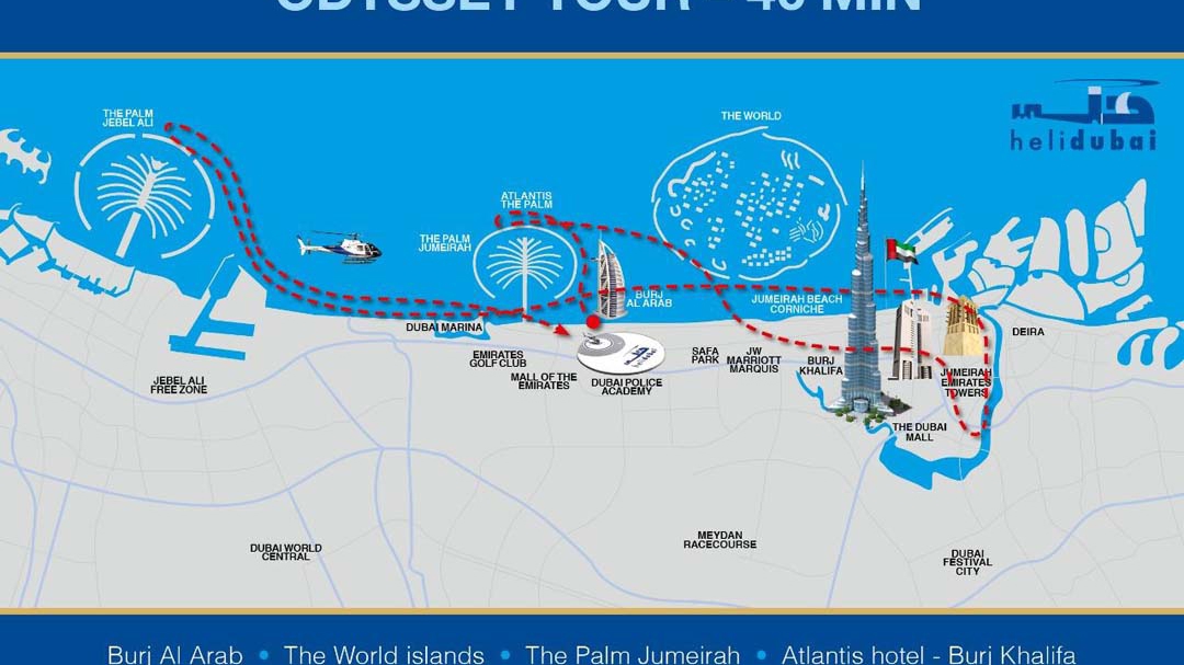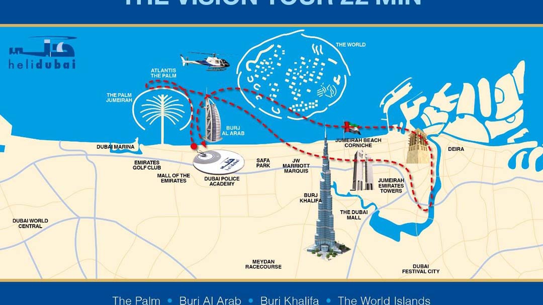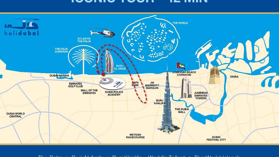 HeliDubai осуществляет полёты с вертолётной площадки Академии полиции Дубая, расположенной в районе Аль Суфух 1, напротив торгового центра Mall of the Emirates.