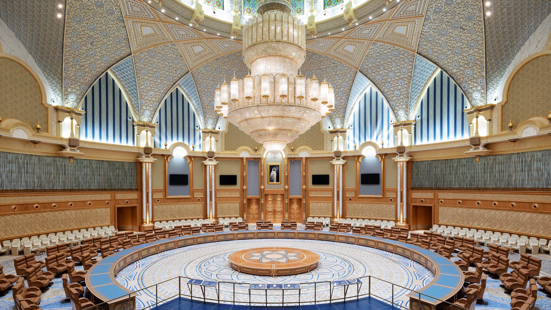 Главное помещение дворца с величественным куполом и роскошной архитектурой.
